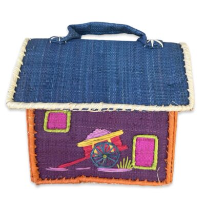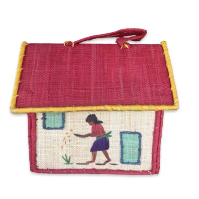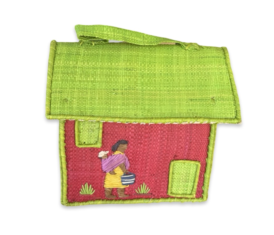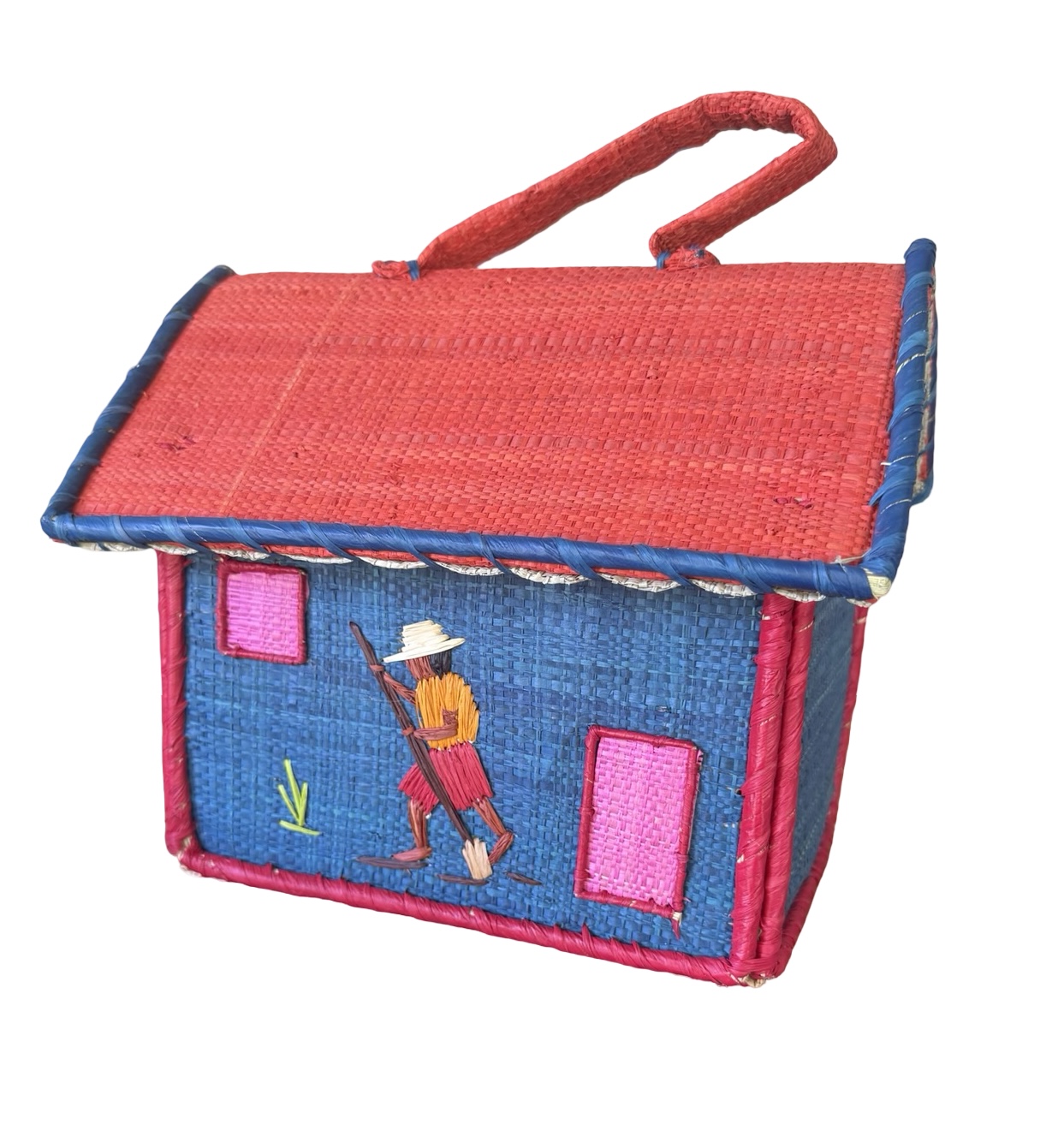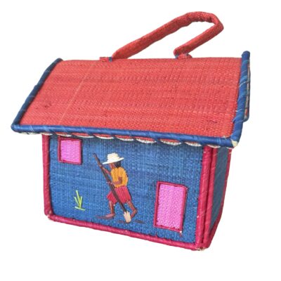 Carefully embroidered using raffia, this little house has a roof that opens to store items.