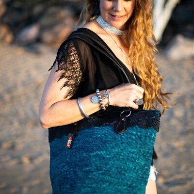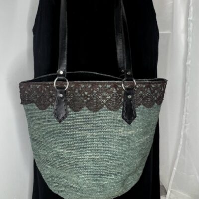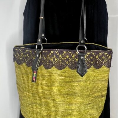 Victoria has a cotton lining inside and detailed, crocheted raffia outside with a lace detail at the top.